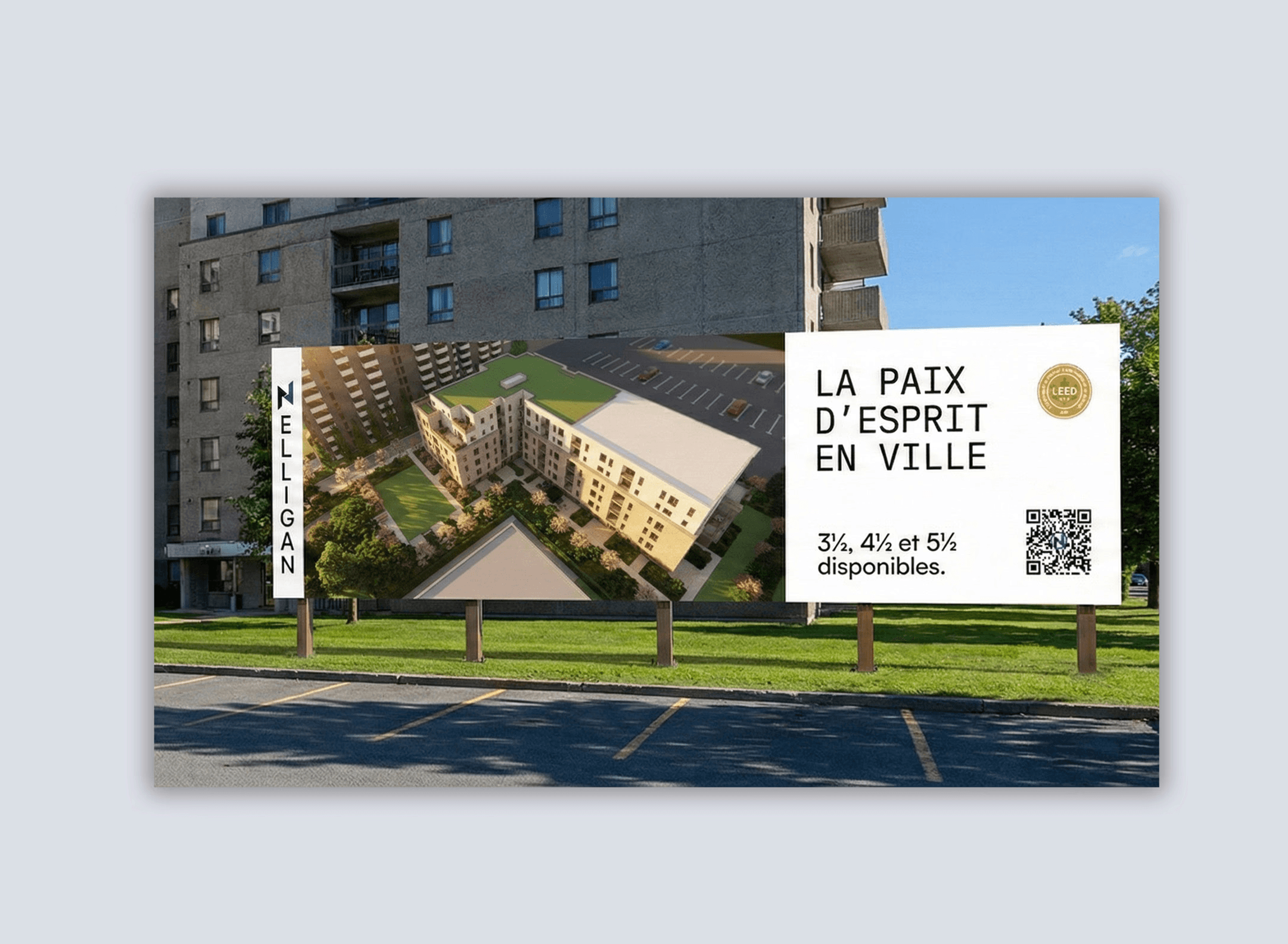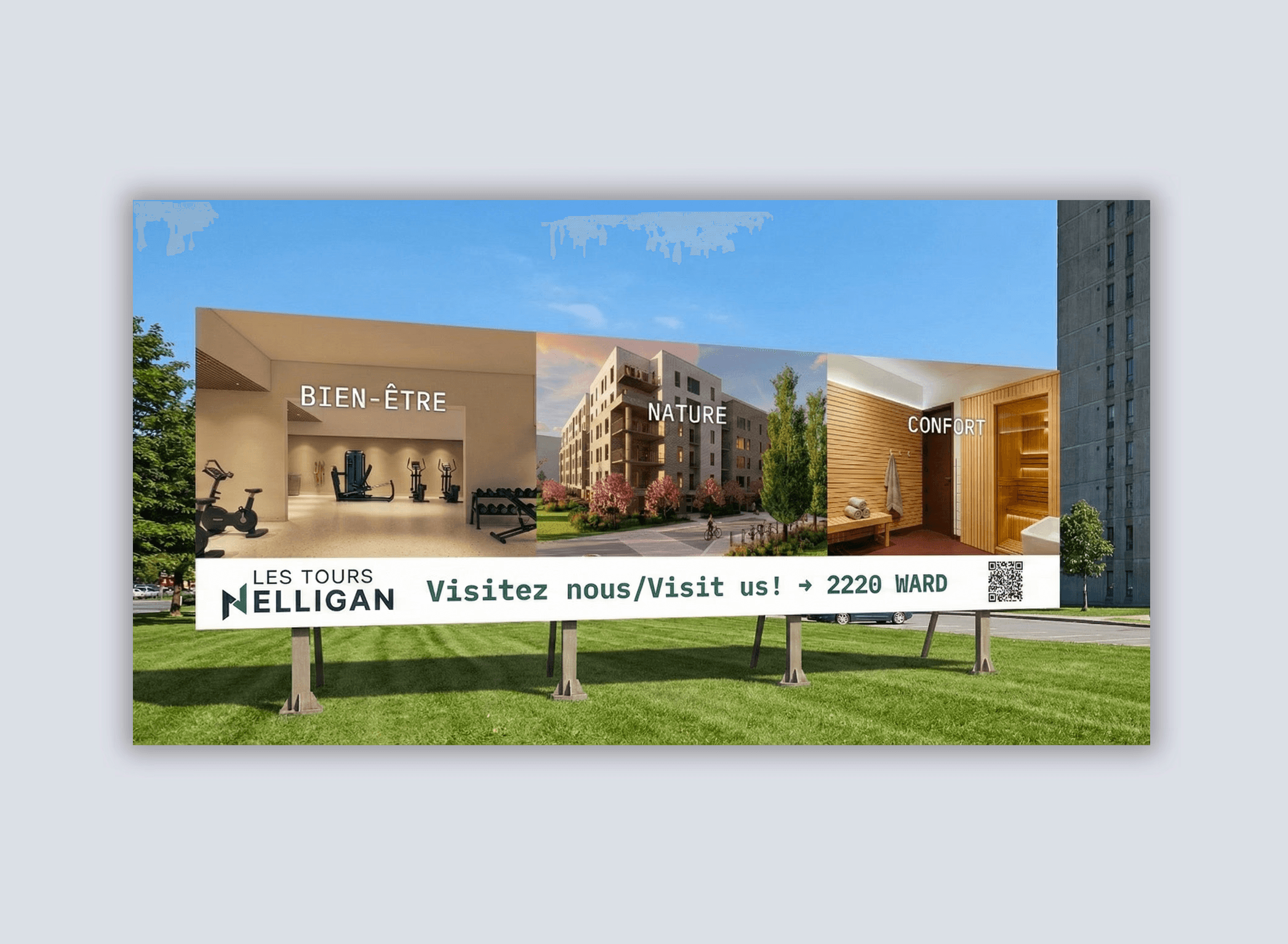 Commercialiser un bâtiment qui n'existe pas encore nécessite un mélange de précision et d'imagination. Pour le 2220 Ward, nous avons conçu des panneaux de signalisation percutants sur site présentant des rendus 3D qui mettent en avant le mode de vie et l'architecture future de la tour, offrant une fenêtre claire sur le potentiel achevé du projet. Des rendus 3D plus raffinés ont été ajoutés au micro-site des visites.