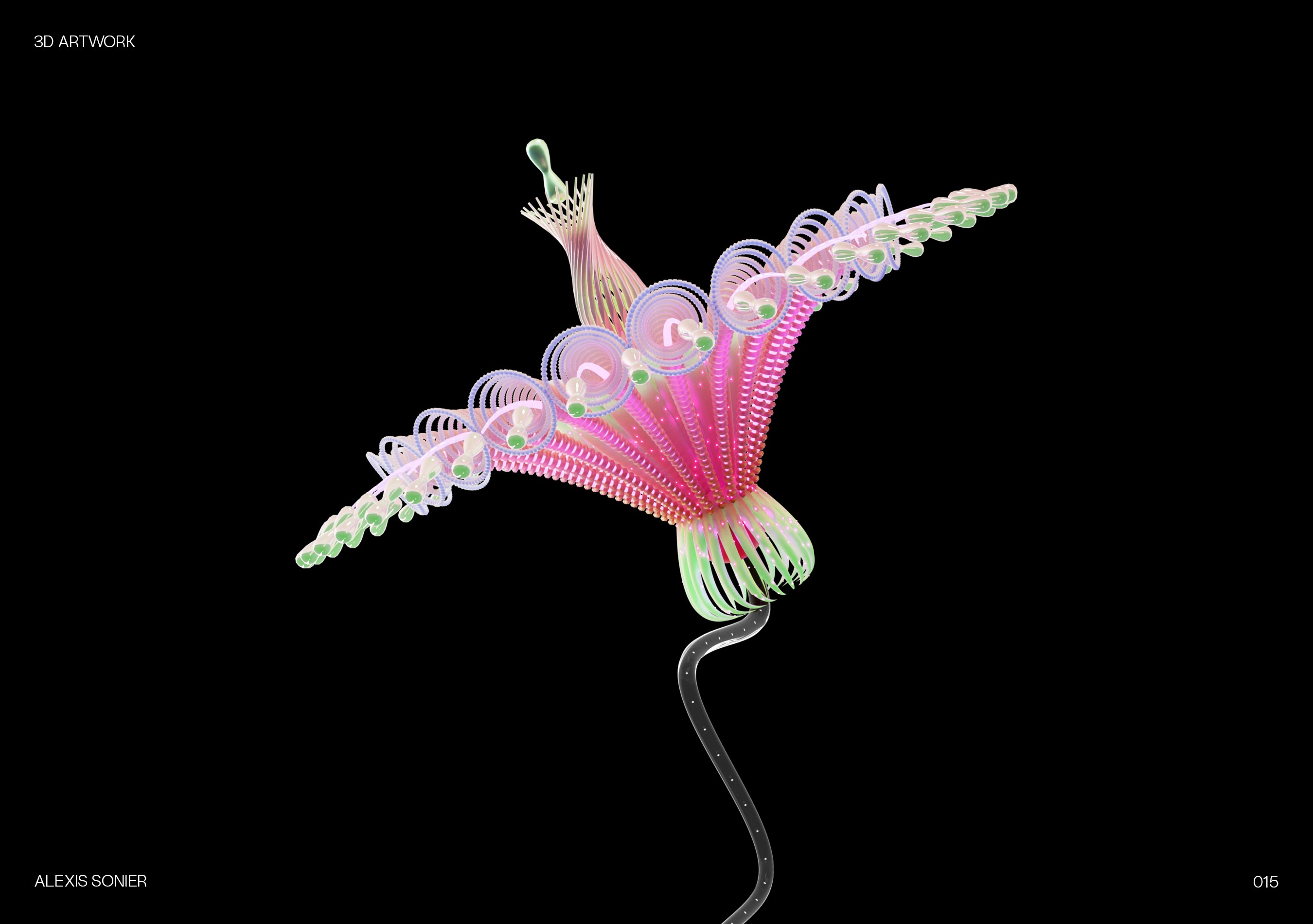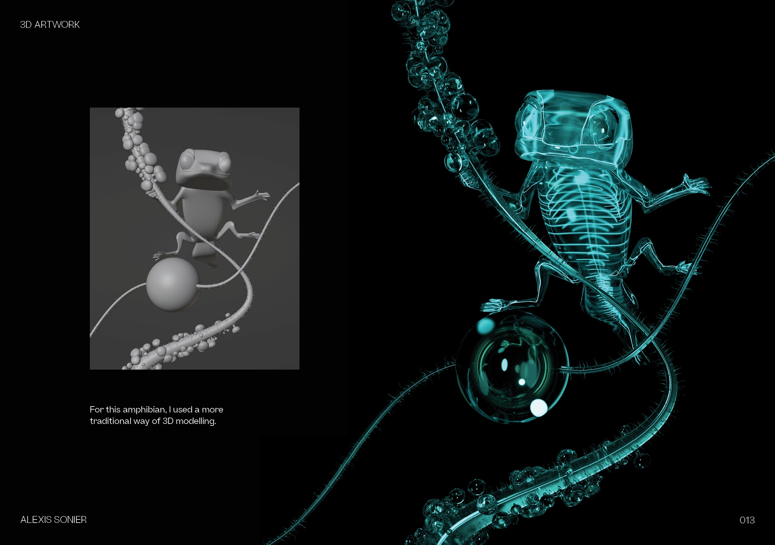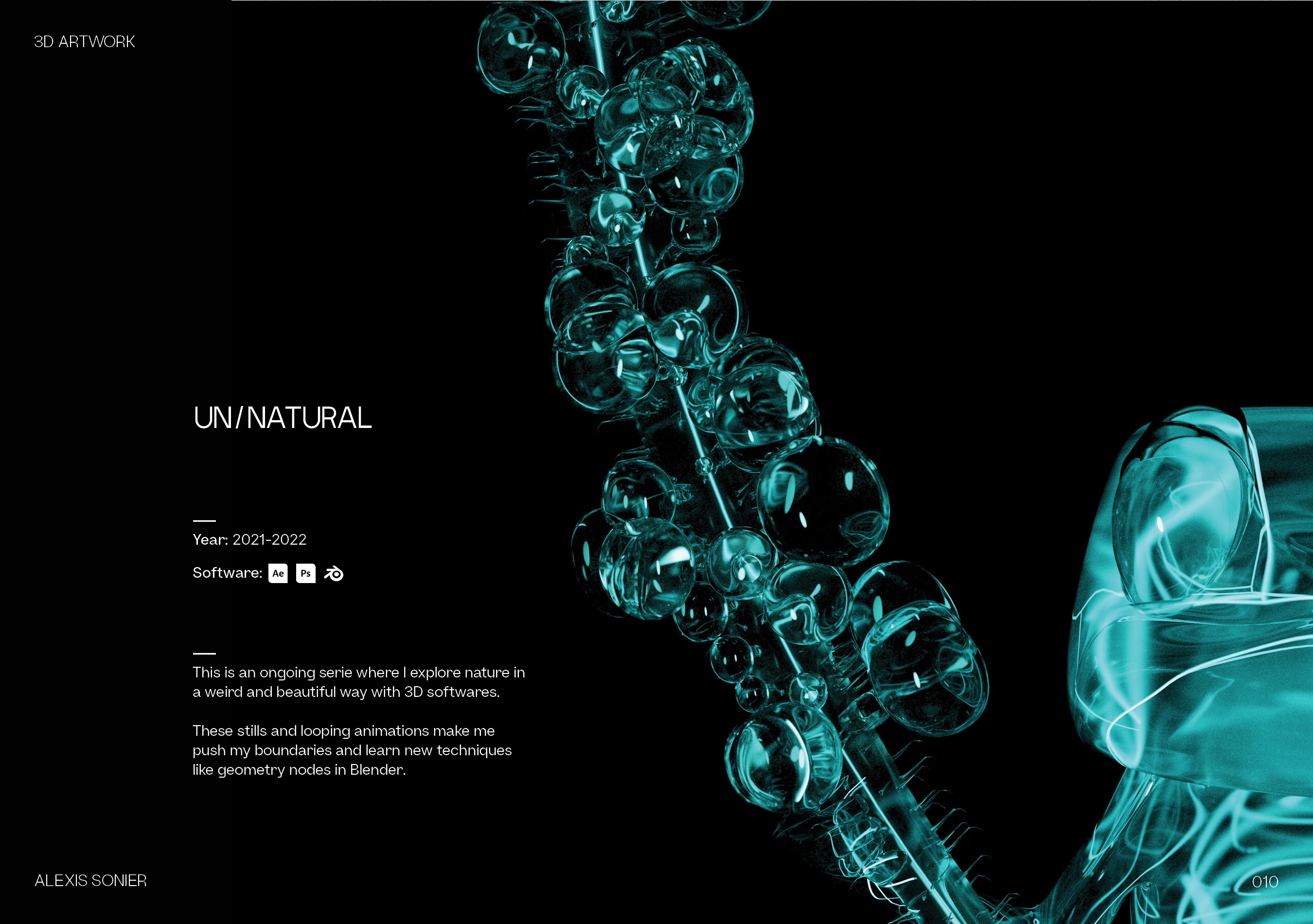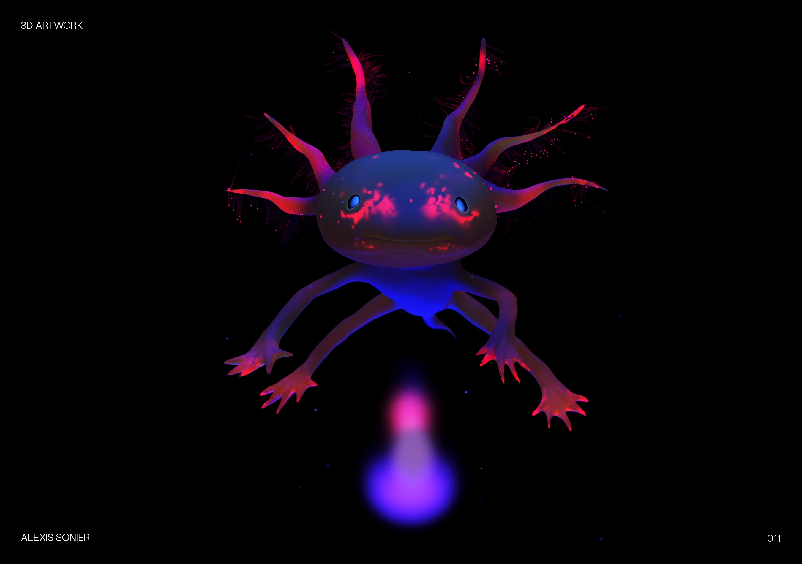La manière la plus efficace de maîtriser de nouveaux outils est de jouer. Cette collection représente mon carnet de croquis numérique : un espace où je teste les limites de l'éclairage, des systèmes de particules et de la physique des matériaux. Que ce soit pour simuler la translucidité de la peau de reptiles ou la géométrie complexe des cellules microscopiques, chaque rendu est une étude technique conçue pour affiner mon flux de travail et élargir mon vocabulaire visuel.