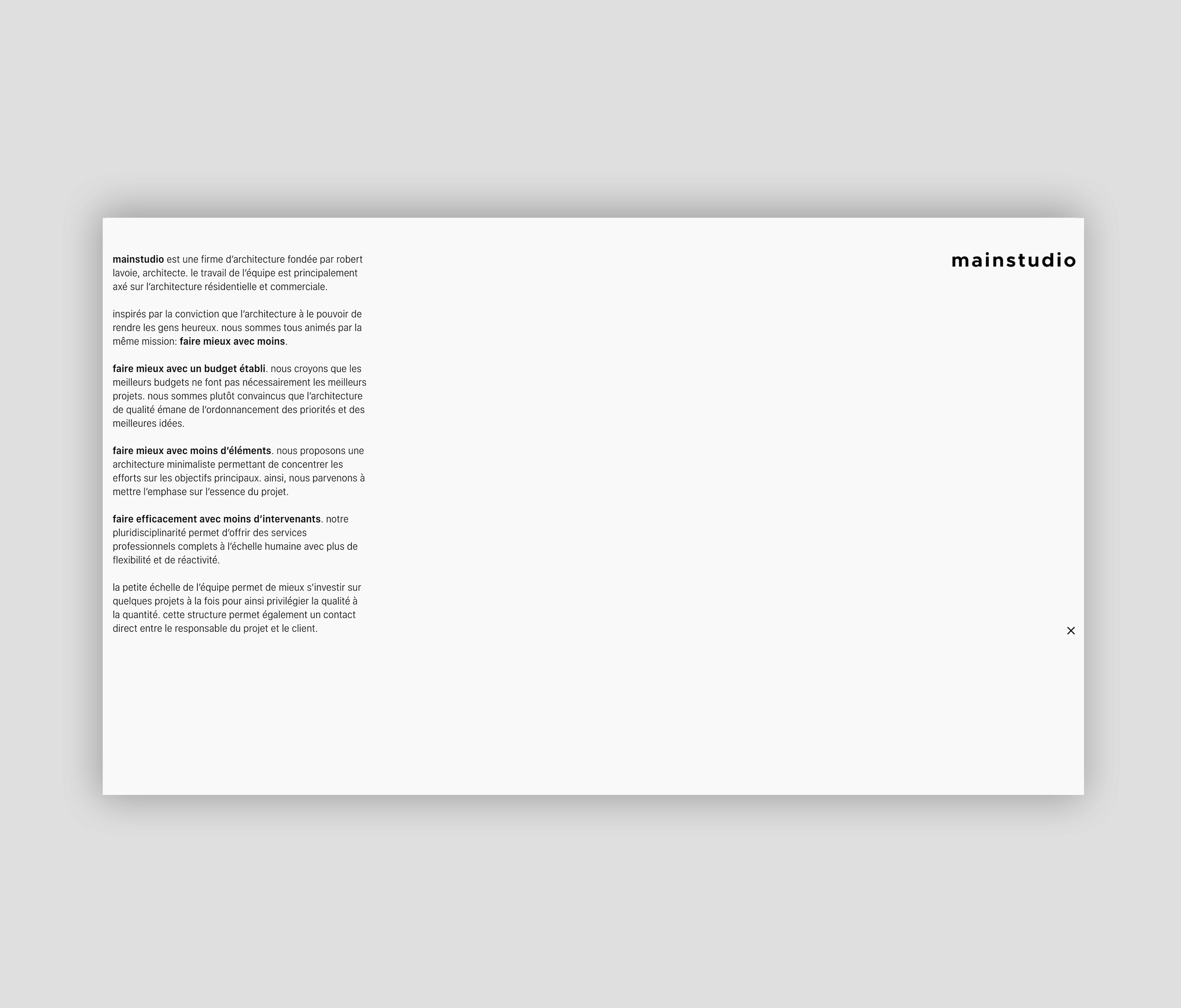 L'objectif de Mainstudio était de créer un environnement numérique où l'architecture reste le protagoniste. Nous avions pour tâche de prototyper et de lancer un portfolio web ciblé qui élimine les distractions inutiles, en utilisant une mise en page épurée et centrée sur l'image. Le résultat est une expérience utilisateur simple qui reflète la précision et l'esthétique des œuvres architecturales qu'elle met en avant.